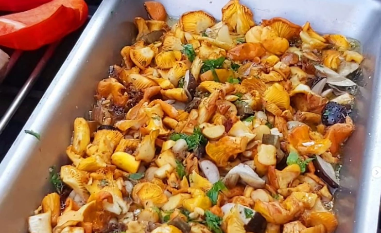 In einer geführten 3-stündigen Pilzexkursion sammeln wir gemeinsam frische Funde, die anschließend bestimmt und unter Anleitung eines geprüften Pilzsachverständigen (DGfM) geputzt, vorbereitet und am Grill zubereitet werden (weitere 2-3 Stunden).