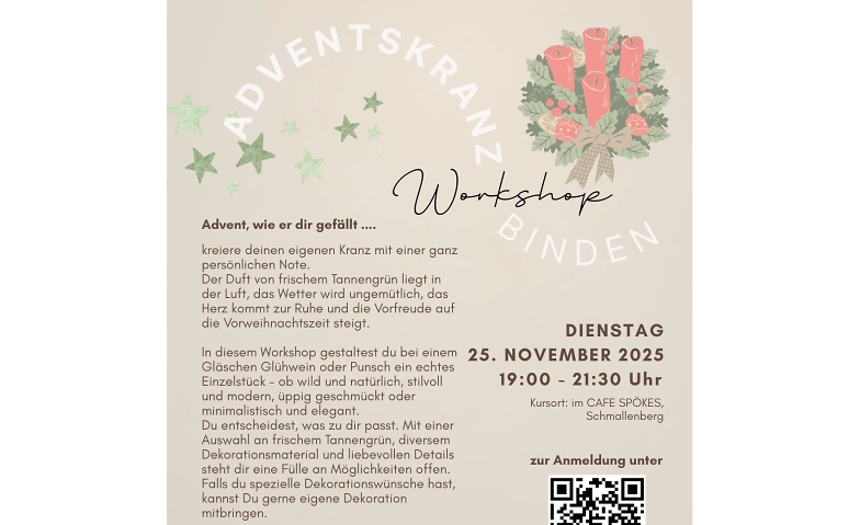 In diesem Workshop gestaltest du bei einem Gläschen Glühwein oder Punsch zum Anstoßen ein echtes Einzelstück – ob wild und natürlich, stilvoll und modern, üppig geschmückt oder minimalistisch und elegant. Du entscheidest, was zu dir passt. Mit einer Auswahl an frischem Tannengrün, diversem Dekorationsmaterial und liebevollen Details steht dir eine Fülle an Möglichkeiten offen. Wer mag, kann Trockenblumen oder einzelne Trocken-Elemente einarbeiten – oder mit glänzenden Kugeln festliche Highlights setzen.Falls du spezielle Dekorationswünsche hast, kannst Du gerne eigene Dekoration mitbringen.