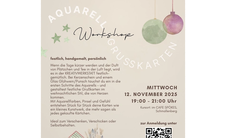 Wenn die Tage kürzer werden und der Duft von Plätzchen und Tee in der Luft liegt, wird es in der KREATIVWERKSTATT festlich-gemütlich. Bei Kerzenschein und einem Glas Glühwein/Punsch tauchst du ein in die ersten Schritte des Aquarells – und gestaltest festliche Grußkarten im weihnachtlichen Stil, die von Herzen kommen.
