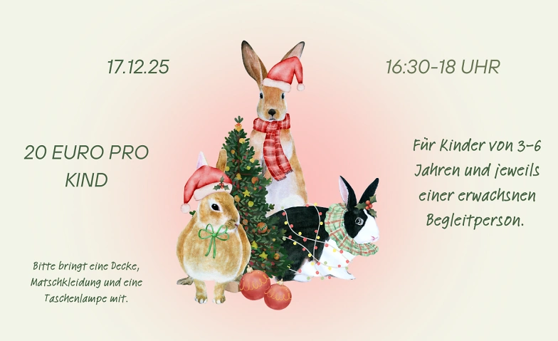 Das Programm findet für Kinder im Alter von 3-6 Jahren am 17.12.2025 von 16.30 Uhr-18 Uhr auf unserem Hof statt. Jedes Kind kann eine erwachsene Begleitperson mitbringen. Für die erwachsene Begleitperson wird kein wieteres Ticket benötigt.