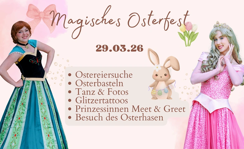 Tauche ein in ein zauberhaftes Osterfest mit den liebenswerten Prinzessinnen Dornröschen und der Eisprinzessin! Gemeinsam erleben wir eine magische Zeit voller kreativer Bastelaktionen, fröhlicher Tänze, lustiger Spiele und einer spannenden Ostereiersuche mit dem Osterhasen.