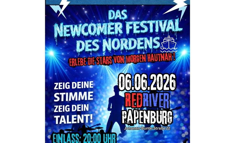 Werde Teil dieser musikalischen Revolution! Erlebe eine Nacht voller Entdeckungen, Leidenschaft und unvergesslicher Momente. Sei dabei, wenn die Stars von morgen das Red River zum Beben bringen und du Teil einer neuen Ära der Musikgeschichte wirst. Sichere dir jetzt dein Ticket und sei nicht nur Zuschauer, sondern Teil des Newcomer Festivals des Nordens!