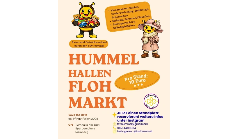 Willkommen bei unserem ersten Flohmarkt! Wir vom TSV Hummel Nürnberg e.V. stehen für Sport, Bewegung und vor allem für Gemeinschaft. Deshalb laden wir euch herzlich ein, Teil unseres bunten Kinder-, Mama- und Kreativ-Flohmarkts zu werden.
