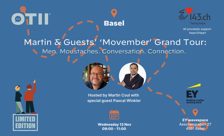 This Movember, Martin Coul brings his Grand Tour to Basel for an evening of open dialogue on men’s mental health. Losing a parent to schizophrenia as a young child, and later navigating his own experiences with depression and PTSD, shaped the lens through which Martin approaches well-being. Mental health chose him, not the other way around - and it’s why he’s committed to tackling the conversations many still shy away from.