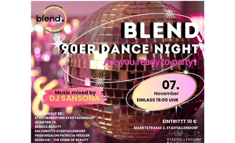 Blend 90er Party Night mit DJ Sansona 🎧✨ Eintritt: 10€ Are you ready to party? 🚀 Kommt vorbei und feiert die besten Hits der "goldenen 90er" mit uns!