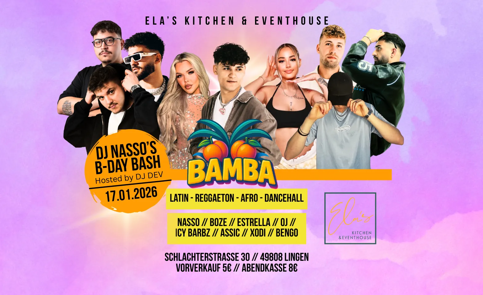 BAMBA - DJ Nasso's B-Day Bash w/ DJ BOZE, ICY BARBZ & more Ela's Kitchen & Eventhouse, Schlachterstraße 30, 49808 Lingen (Ems) Billets