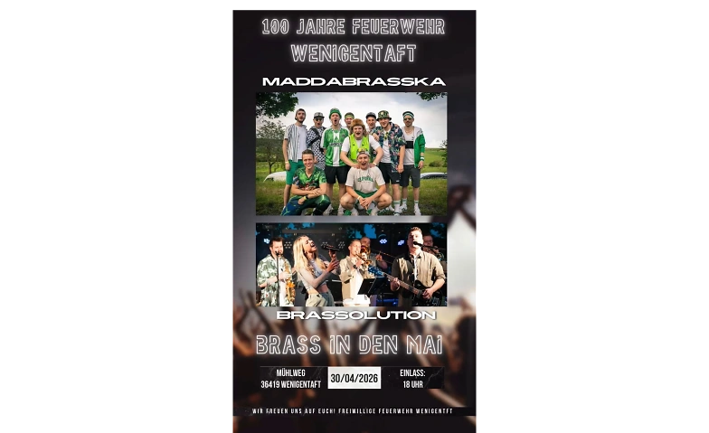 2026 feiert unsere Feuerwehr ihr stolzes 100-jähriges Jubiläum – und das starten wir am 30. April 2026 mit einem musikalischen Highlight: Brass in den Mai mit den Live-Acts Maddabraskka und Brassolution.