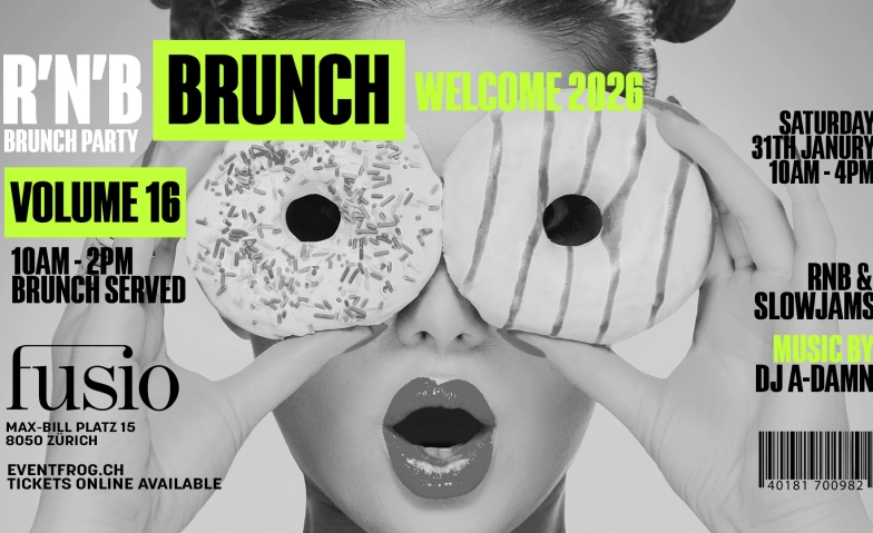 Am 31. Januar steigt zum 16. mal die RNB BRUNCH PARTY im Fusio Zürich. Wir starten um 10:00 Uhr mit einem köstlichen à la carte Brunch während im hintergrund bereits smoothe RNB-Klassiker zu hören sind. Erlebt eine einzigartige Atmosphäre, während unser DJ die heissesten RNB-Hits von damals und heute auflegt. Stündlich wird die Musik lauter und wir starten unsere Brunch Party!