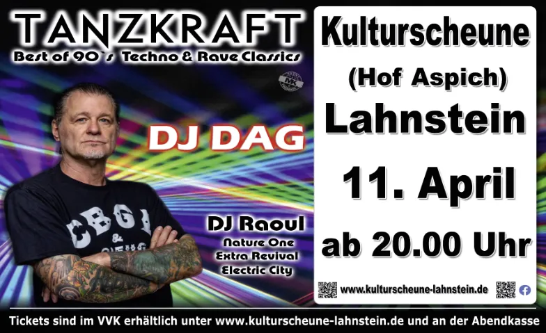 Am Samstag 11. April ab 20 Uhr steigt die nächste 90er Techno & Rave Classics Party in der Kulturscheune Lahnstein auf dem Aspich.