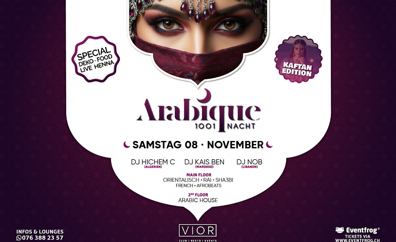 Am Samstag, den 8. November, verwandelt sich der Vior Club Zürich erneut in ein orientalisches Erlebnis der Extraklasse! Mit der Arabique – Special Kaftan Edition erwartet euch eine unvergessliche Nacht voller arabischem Flair, stilvoller Mode und mitreissender Musik. Als Special Guest reist niemand Geringeres als Agostina an, um die Tanzfläche mit heissen Rhythmen und exklusiver arabischer Musik zum Beben zu bringen.