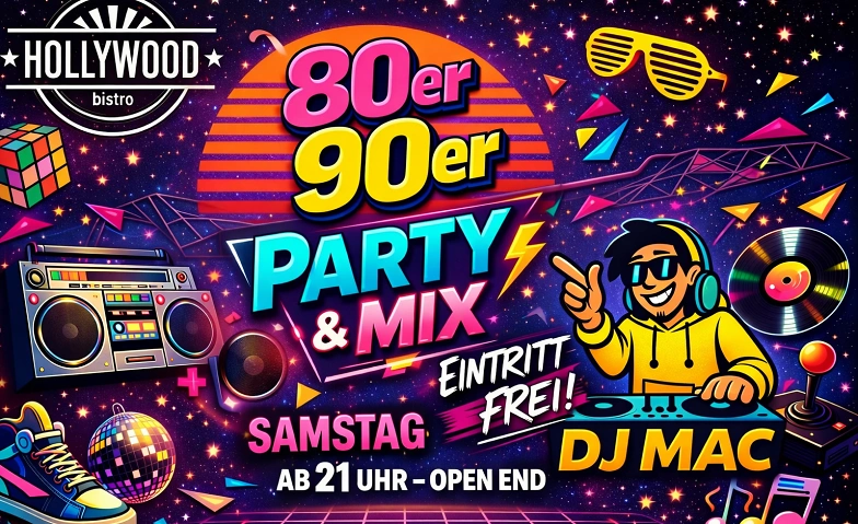 Feiere mit uns die ultimative 80er & 90er Party im Hollywood Bistro! Tauche ein in die besten Hits zweier legendärer Jahrzehnte und bring deine Freunde mit zu einer Nacht voller Retro-Vibes, guter Laune und unvergesslicher Beats.