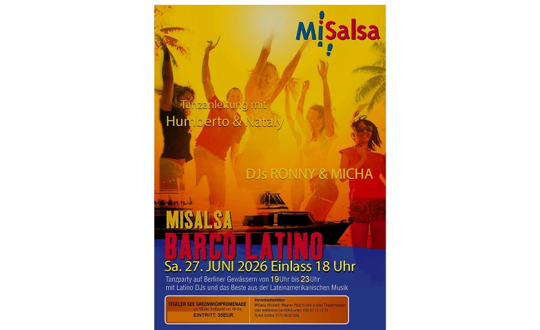 Am Samstag, 27. JUNI möchte das MiSalsa Team mit euch auf dem Schiff "BERLIN" große Wellen schlagen! Treffpunkt ist die Anlegestelle Greenwichpromenade Tegler See. Hier geht es am 27.06.2026 ab 19 Uhr los. Mit lateinamerikanischen Klängen wie Salsa, Merengue, Bachata, Tecno Cumbia und Latin Pop werden wir den Berliner Sommer begrüssen!!!