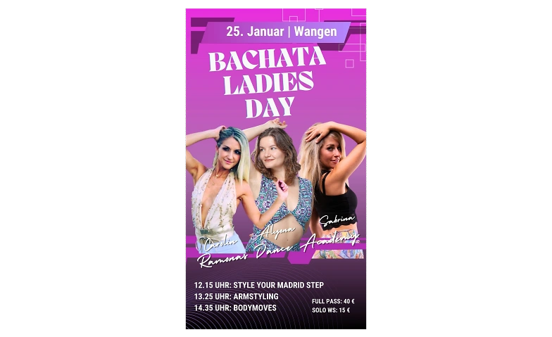 Lerne von drei erfahrenen und top ausgebildeten Bachateras, die dein Ladystyling auf das nächste Level bringen. Verbessere deine Technik und genieße einen Tag, der ganz dir gehört.
