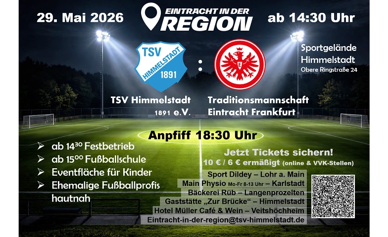 Tickets für das Event inkl. dem Freundschaftsspiel können über Vorverkaufsstellen oder unter eintracht-in-der-Region@tsv-himmelstadt.de erworben werden, Ticketpreis 10 €/ 6 € ermäßigt