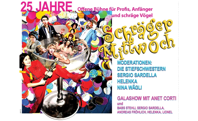 Am Jubiläumsabend treten ausgewählte Künstlerinnen und Künstler auf, die den Schrägen Mittwoch in den letzten Jahren geprägt haben. Anet Corti moderiert den Jubiläums-Gala-Abend.