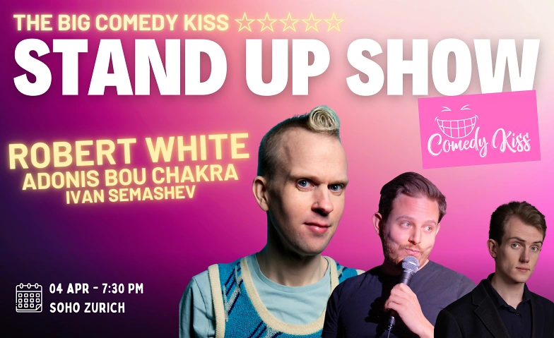 The Big Comedy Kiss, featuring Robert White, Adonis Bou Chakra, and Ivan Semashev — three great acts, unstoppable laughs!