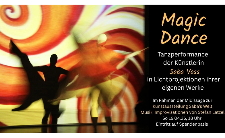 In ihrer Tanzperformance „Magic Dance“ zur Midissage ihrer Kunstausstellung „Saba´s Welt“ erweitert Saba Voss den malerischen Raum, dabei bildet sich eine Synergie aus Kunst, Musik und Tanz. Begleitet wird sie mit Livemusik von Stefan Latzel. Die Zuschauer erleben die spontane Ausdruckskraft der Künstlerin in der Lichtprojektion ihrer eigenen Werke.