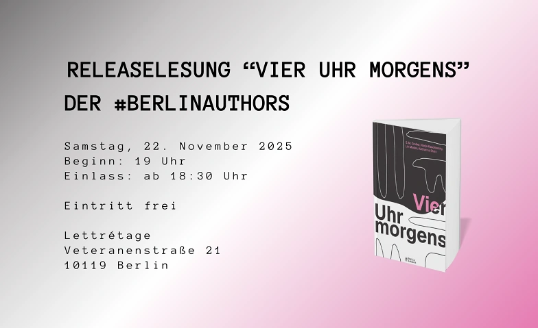 “Vier Uhr morgens” ist die bereits fünfte Anthologie des Literaturnetzwerks #BerlinAuthors. Mit regelmäßigen Netzwerkveranstaltungen, Lesungen und Publikationen setzen sich die #BerlinAuthors dafür ein, einen niedrigschwelligen Zugang zur Literaturwelt zu schaffen und Schreibende aller Genres, Ursprünge und Erfahrungsgrade vernetzen.
